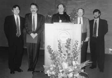 NASW officers Paul Raeburn (center) presented the 1998 Science-In-Society Awards to (l-r) Robert Langreth, John Palfreman, David Stipp and David Whitaker.