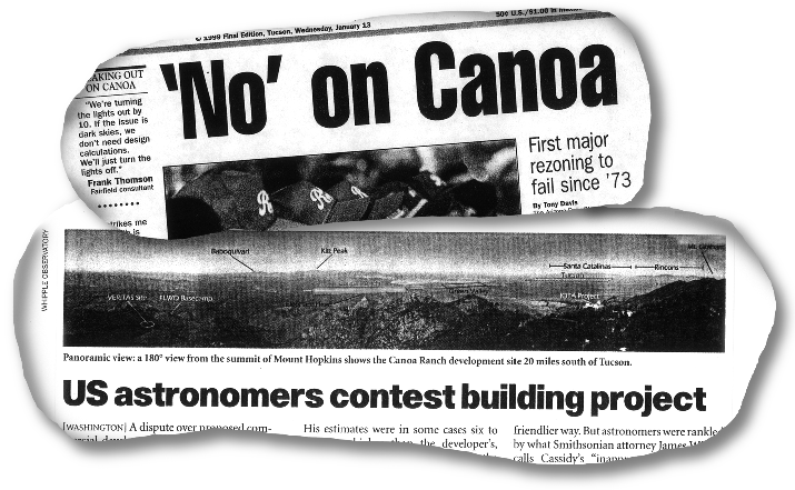 If the threat was intended to scare us away, it had the opposite effect: it lined up the Smithsonian and Naval Observatory behind us and galvanized the astronomic community in general. The press took it as a restraint on free speech, and suddenly we were talking to editorial boards. All Canoa Ranch Plan opponents contacted us and kept us posted on their activities. Both Tucson dailies thumped Fairfield in editorials with titles like "Fairfield's Crude Threat."